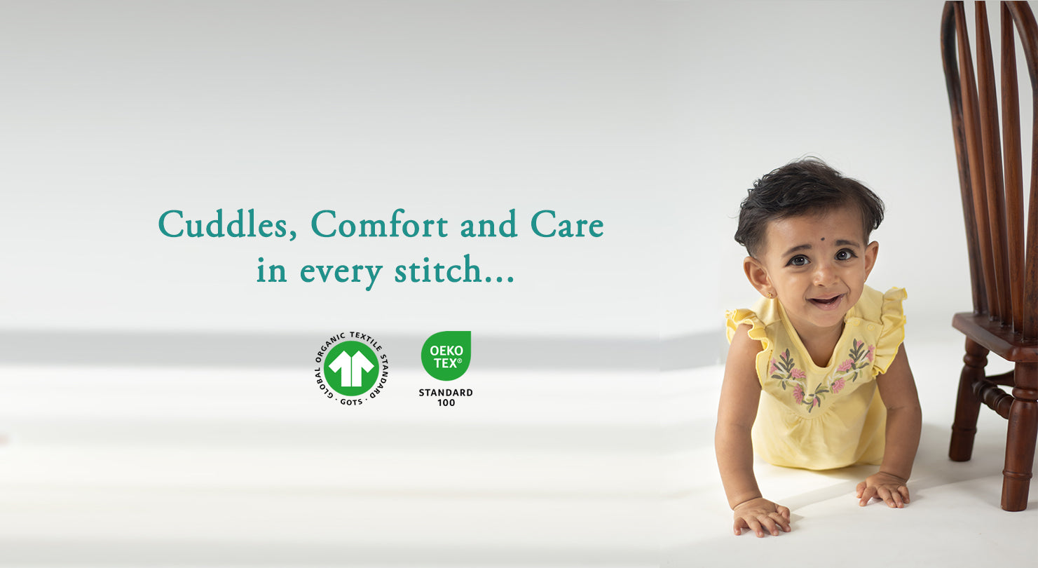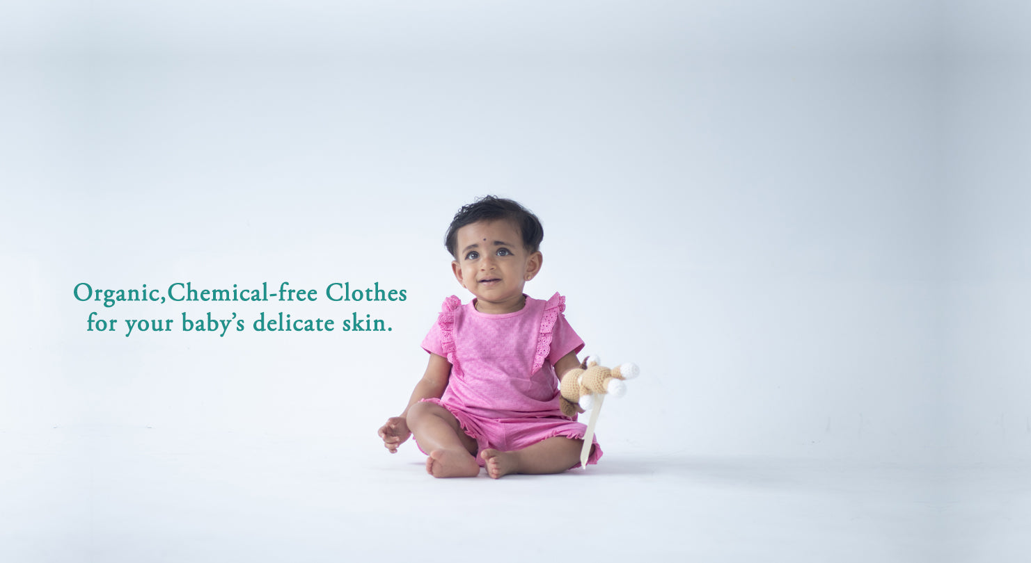 Our organic cotton is grown without harmful chemicals, ensuring purity and natural softness for your little one. Our dyes are non-toxic, and our designs prioritize breathability and ease of movement keeping your baby cozy, happy, and cared for, naturally.